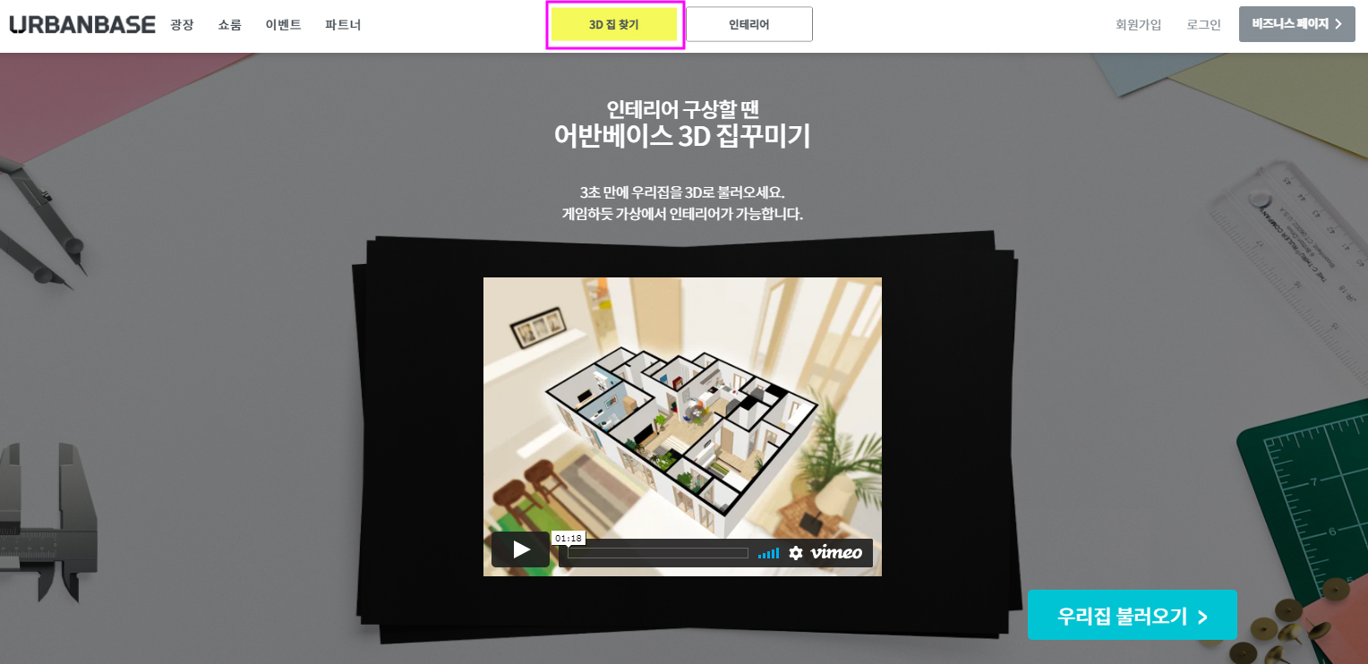 어반 베이스는 꾸미고 싶은 집의 주소를 입력하면 자동으로 3D 도면을 불러와 주며, 사이트에서 제공되는 여러 가지 도구를 활용해 쉽고 빠르게 집을 스타일링할 수 있습니다. 또한 배치하는 가구들이 현재 시판 중이거나 비슷한 가구들로 되어 있어 배치했던 가구의 구매가 용이하도록 되어 있습니다. 다만 모든 집들의 도면이 등록돼 있다기 보단 아파트 위주로 도면이 등록되어 있어, 다른 형태의 집들은 도면이 불러지지 않는 아쉬움이 있습니다.