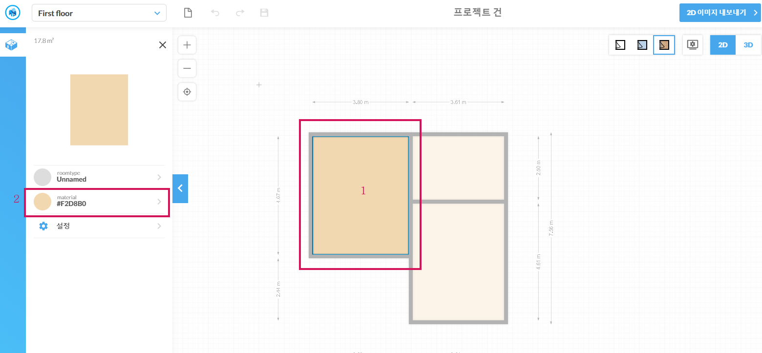 - 사용 팁) 바닥의 색 채우기, 1번과 같이 공간을 클릭한 후 2번을 클릭하여 페인트 또는 재료(나무, 돌 등)를 선택하시면 됩니다.