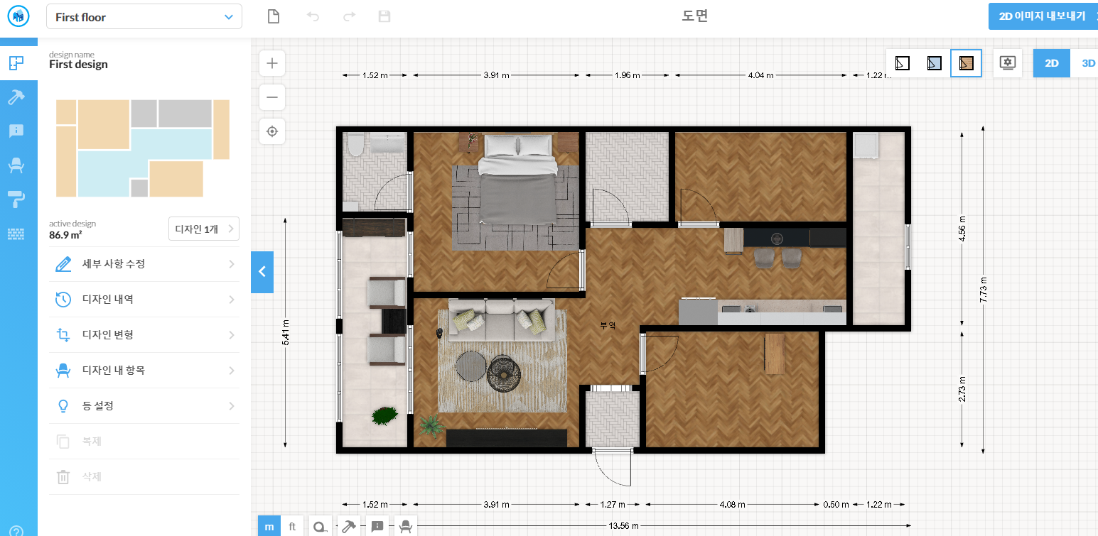 플로어플래너는 어반베이스와 달리 본인이 방 치수를 설정해 공간을 그려 하나의 도면을 완성하는 방식입니다.