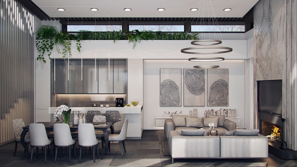 하얀색과 여러 톤의 그레이 색상 그리고 물결 모양의 철제 벽과 대리석 벽난로로 거실을 세련되게 꾸며보세요.