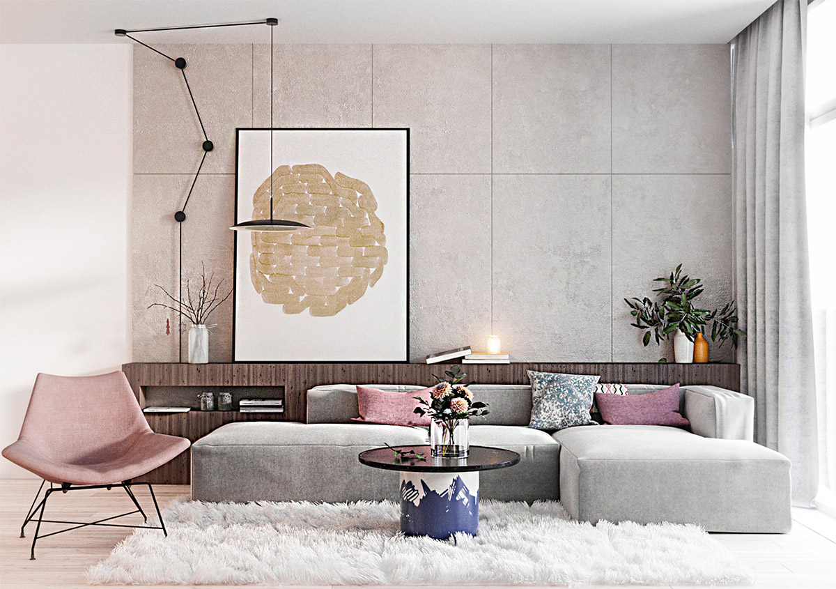 밝은 회색 벽과 파스텔 핑크색 가구의 조합이 공간을 좀 더 아늑하고 안락해 보이게 합니다.