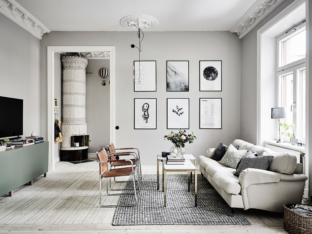 어두운 스칸디나비아 스타일 인테리어입니다. 고양이 액자와 공업용 조명을 더하니 공간이 한 층 더 재미있어집니다.