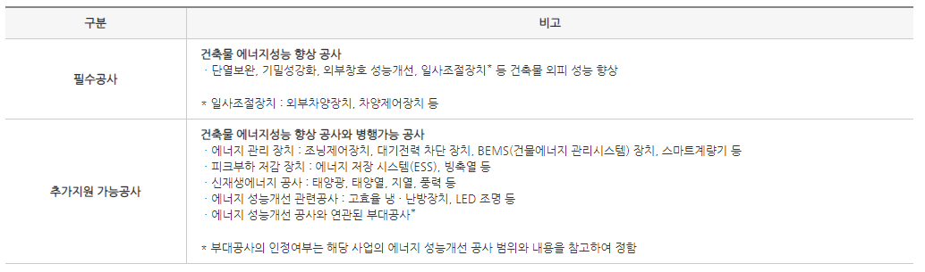 그린리모델링의 대상이 되려면 정부에서 지정한 공사를 포함해야 합니다. 아래 표를 보시면 필수 공사와 추가 지원 가능 공사가 있는데, 필수 공사는 항목 중 한 가지 이상을 반드시 해야 하고, 추가 지원 가능 공사는 필수 공사와 더불어 추가로 지원 가능한 공사를 의미합니다.