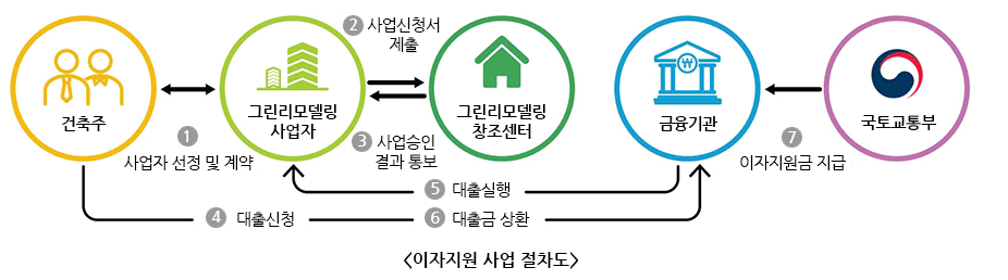 그린리모델링 이자지원사업은 단독주택, 아파트 등 개인 건축물의 에너지 성능개선 촉진을 위해 진행되는 정책으로, 건축주가 은행에서 공사비 대출을 받으면 그 이자의 일부를 정부에서 지원해주는 사업입니다.