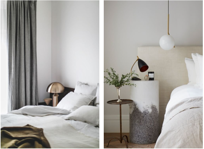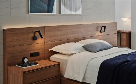 침실은 휴식을 취하는 공간이기 때문에 너무 밝은 빛을 내는 직접 조명 보다는 빛을 부드럽게 분산시켜주는 간접조명을 침대 주변에 놓아주는 것이 좋습니다. 벽부등, 테이블 스탠드 또는 플로어 스탠드와 같은 보조 조명을 놓아주면 은은한 불빛이 방을 차분하고 고급스러워 보이는 효과를 줄 수 있습니다.