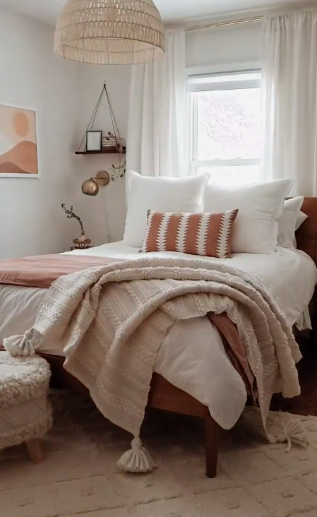 방에서 가장 넓은 면적을 차지하는 침대는 방의 분위기를 바꾸는데 가장 중요한 요소입니다. 호텔처럼 꾸미고 싶다면 침구는 화이트 톤으로 구매하시는 것이 좋습니다. 그리고 깨끗하게 정돈된 흰색의 침구 위에 방의 배경색과 어울리는 톤의 쿠션을 장식해 편안한 느낌을 만들어 주세요. 베개와 쿠션 등 여러 개 있는 것이 싫다면 이불 위에 얇은 블랭킷(이불)으로 데코해 주셔도 좋습니다.