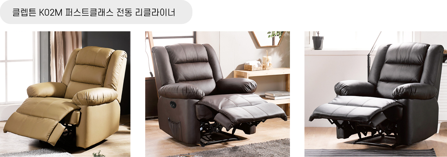 디자인이 조금 투박하지만 갖출건 다 갖춘 최고의 가성비 클렙튼 리클라이너 입니다. K06M은 친환경 인증을 받은 SEO등급의 소나무 건조목이 뼈대로 사용되었고 마감재는 천연가죽은 아니지만 인조와 천연가죽의 장점만을 가져온 브레스레더라는 신소재가 사용되었다고 합니다. 브레스레더는 천연가죽보다 내구성, 신축성, 복원력, 통기성 등 더 우수하다고 하네요.