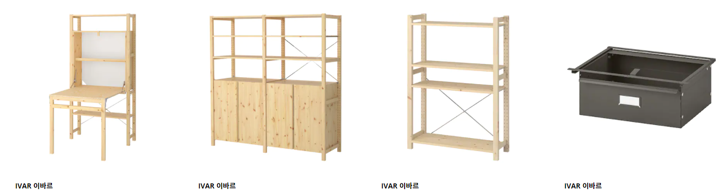 이케아에서 이바르를 검색하시면 여러제품이 나올 텐데요. 이바르는 내 마음대로 여러 유닛을 조합해서 구매하거나 조합하기 귀찮고 복잡하다 하시면 미리 조합이 되어 있는 제품을 구매하실 수도 있습니다.