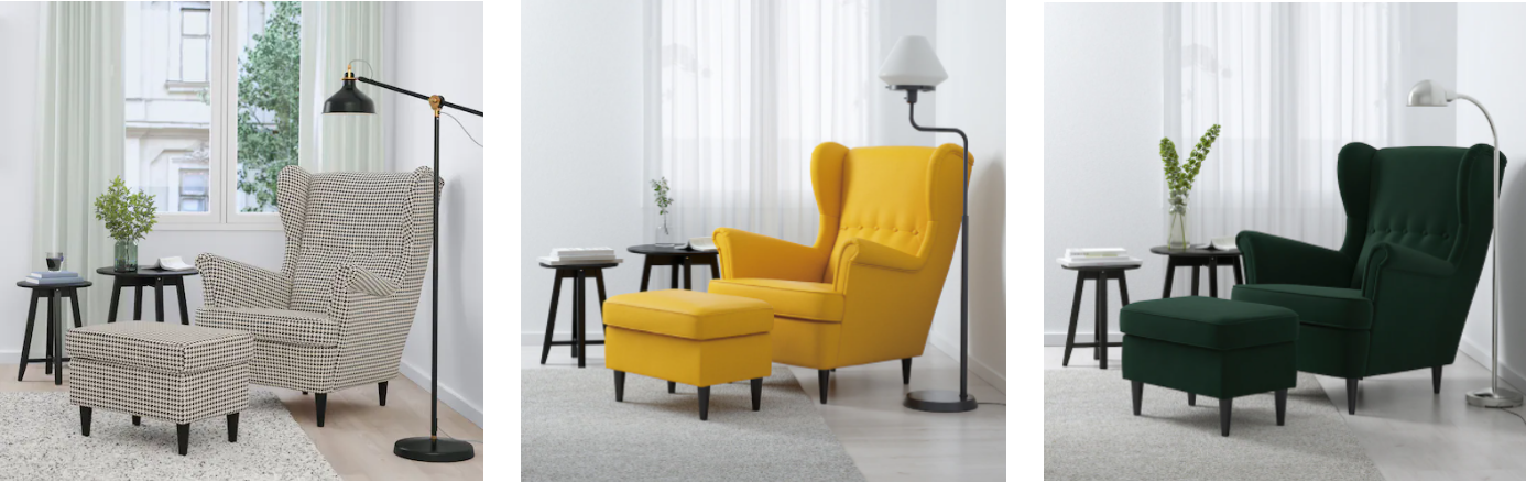 이케아에서 인기 있는 제품 중 하나인 스타란드몬 입니다. 색상이 총 8개로 톡톡 튀는 레드/옐로, 고풍스러운 느낌의 다크 그린, 다크 그레이, 클래식한 하운즈투스 패턴 등 색상이 다양해 취향대로 고르기 좋은 제품인데요. 현재 레드와 라이트 베이지는 품절이라 판매하지 않고 있네요. 이 제품도 세트 풋 스툴이 있어 편안하게 사용할 수 있는 제품입니다.