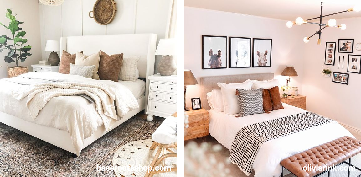 헤드보드가 없는 기본 침대 프레임과 침대 헤드보드가 낮아 보이지 않는 침대 프레임을 사용하면 침구, 거울, 그림, 식물 등 데코 하는 소품에 따라 침실 분위기 변화를 주기가 더욱 쉬워집니다.