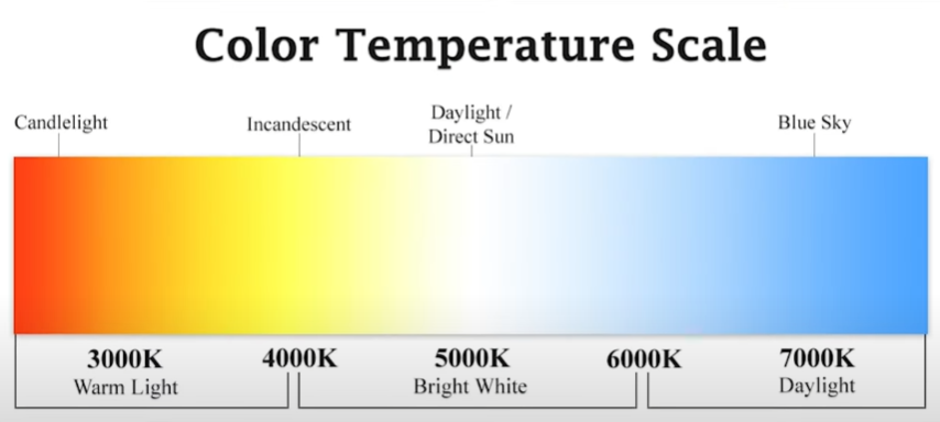 조명의 색온도는 켈빈(Kelvin)이라는 단위로 측정되는데, 숫자가 높으면 푸른빛이 도는 차가운 느낌이고, 숫자가 낮을수록 붉은빛이 도는 따뜻한 느낌이에요.
