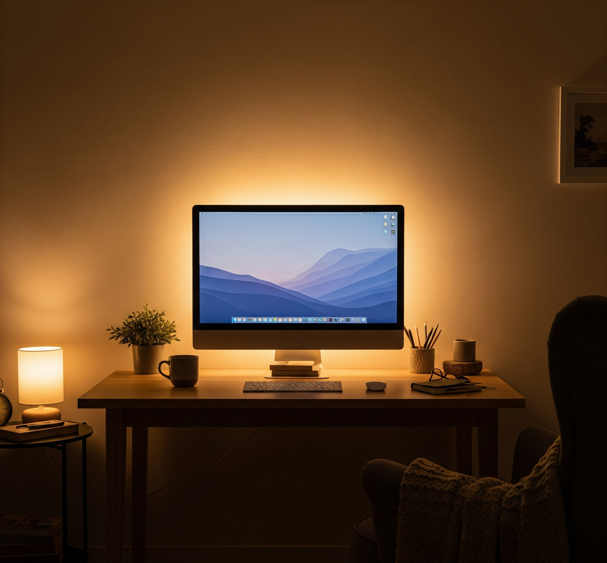 이럴 때는 스크린 뒤에 간접 조명, 즉 백라이트(Backlight)를 설치하는 것이 좋아요. 스크린과 주변의 밝기 차이를 줄여주어 눈의 피로를 덜어주고, 동시에 따뜻한 빛이 스크린 뒤에서 은은하게 퍼져 아늑한 분위기를 더해준답니다. 라이트 바(light bars) 같은 제품을 활용해 보세요!