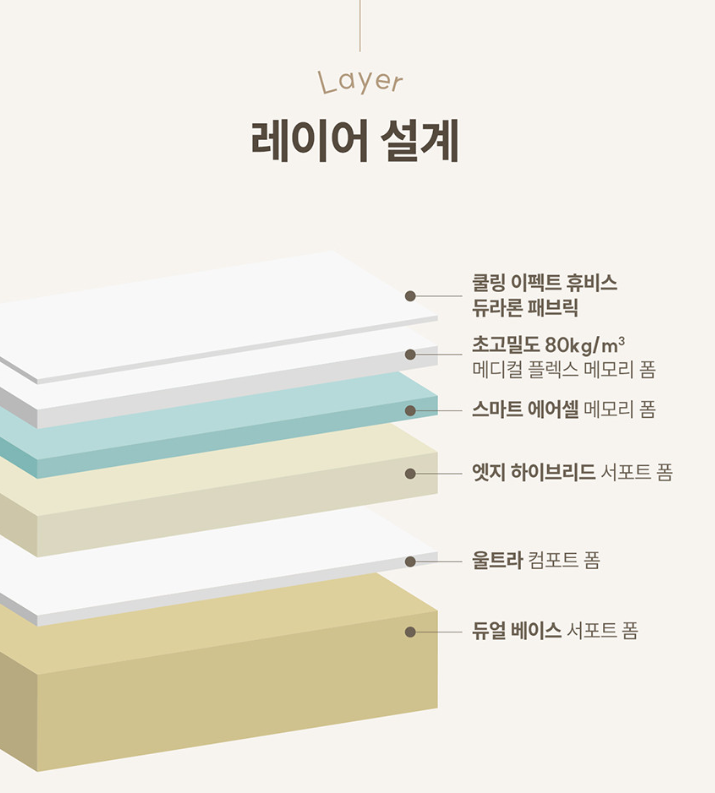 - 특징: [탄탄함과 부드러움] 고밀도 하이브리드 매트리스로, 적절한 균형감을 원하는 분들께 추천합니다.