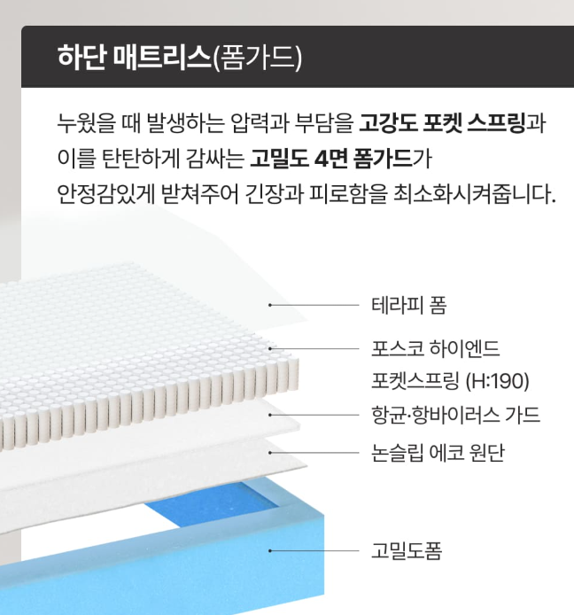 - 특징: [탄탄한 필로우탑] 허리 굴곡에 밀착되는 매트리스로, 탄탄한 지지력을 선호하는 분들께 추천해요.
