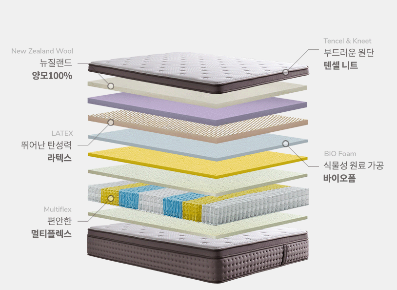- 특징 : 저가 매트리스라고 무시하시면 안되요. 뉴질랜드 양모100%, 천연라텍스, 텐셀니트 원단 등의 고급소재를 넣어 단단하면서도 소프트한 지지력을 선보입니다.