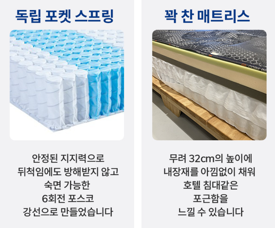 - 지지력을 위한 스프링: 흔들림이 적은 독립 스프링 매트리스를 고르세요. 본넬 스프링은 흔들림이 많으니 피하는 게 좋아요.
