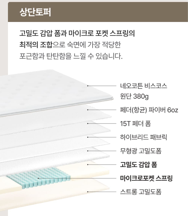 - 안락함을 위한 토퍼(필로우탑): 45kg/m³ 이상의 고밀도 메모리폼 또는 마이크로스프링이 내장된 제품을 추천합니다.